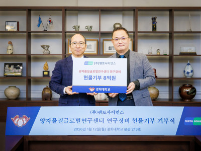 교류/실천“양자 연구를 경희의 브랜드로”2026.01.22URL양자물질글로벌연구센터가 ㈜펨토사이언스로부터 양자 연구 장비를 현물 기부받았다. 지난 1월 12일(월) 서울캠퍼스 본관에서 기부식이 열렸다.㈜펨토사이언스, 8억원 상당의 양자계면 조정 장비 현물 기부양자물질글로벌연구센터와 양자 소자 연구 협력 강화2차원 양자물질 소자개발에 탄력, 인공지능 기반 스마트팹 구축 목표반도체 제작 공정에 활용되는 플라즈마 관련 원천기술을 보유한 ㈜펨토사이언스가 양자물질글로벌연구센터에 8억 원 상당의 양자계면 조정 장치를 기부했다. 양 기관은 이번 기부를 계기로 양자 소자 연구 분야에서 협력 관계를 지속해 나갈 계획이다.이번에 기부된 장비는 양자 소자의 성능을 좌우하는 계면을 정밀하게 제어·분석하는 데 활용된다. 계면은 서로 다른 물질이 만나는 경계로, 이 경계의 상태에 따라 전자가 어떻게 움직이는지가 달라진다. 눈에 보이지 않는 계면의 미세한 차이가 소자의 안정성과 성능을 결정짓는 핵심 요소로 작용한다. 장비 도입을 통해 2차원 양자물질을 포함한 차세대 양자 소자 연구 역량이 한층 강화될 것으로 기대된다. 양자 소자는 양자물질의 특성을 활용해 정보를 처리하거나 신호를 제어하는 초소형 장치로, 차세대 컴퓨터와 센서 기술의 핵심 부품으로 주목받고 있다.지난 1월 12일(월) 서울캠퍼스 본관에서 열린 기부식에 김진상 총장, 지은림 학무부총장(서울), 김도균 대외협력처장, 권영균 이과대학장, 손석균 물리학과 교수와 ㈜펨토사이언스 김무환 대표, 김대현 고문 등이 참석했다.김무환 대표는 “반도체 공정 기술을 기반으로 양자 연구 장비 분야까지 영역을 확장하는 과정에서 경희대학교의 우수한 연구진과 협업을 통해 서로 상생하는 계기가 됐으면 좋겠다”며 “양자 과학과 차세대 반도체, 인공지능 기술이 융합되는 새로운 기술적 전환점에서 이번 협력이 의미 있는 성과로 이어지길 바란다”고 기부 취지를 밝혔다.김진상 총장은 “인공지능 도입과 새로운 제조 공정 알고리즘 개발은 양자 분야 발전의 핵심 요소로, 이러한 미래 산업은 연구실에서 출발한다”며 “양자는 경희가 전략적으로 추진 중인 6대 중점 분야 중 하나다. 반도체 공정 핵심 기술을 보유한 펨토사이언스와 연구 협력은 양 기관이 공동의 목표를 추구한다는 점에서 뜻깊다”고 말했다. “이번 기부를 계기로 두 기관의 협력 관계가 지속될 수 있도록 연구 환경 조성과 인프라 확충에 대한 지원을 아끼지 않겠다”고 덧붙였다.양자물질글로벌연구센터 연구부센터장인 손석균 교수는 “다양한 양자물질 가운데 2차원 물질 기반 소자 개발을 우선 추진할 계획”이라며 “장기적으로는 인공지능을 활용해 소자 제작, 공정, 측정 전 과정을 통합적으로 수행하고 연구자는 이를 모니터링하는 ‘스마트 팹(Smart Fab)’ 구축을 목표로 하고 있다”고 밝혔다. 이어 “외부 연구기관 및 대학과 공유하는 개방형 스마트 팹을 통해 양자 연구를 경희대학교의 새로운 브랜드로 발전시키고자 한다”고 포부를 밝혔다.SDG 4 - 양질의 포괄적인 교육제공과 평생학습기회 제공SDG 7 - 적정가격의 지속가능한 에너지 제공SDG 8 - 지속가능한 경제성장 및 양질의 일자리와 고용보장SDG 9 - 사회기반시설 구축, 지속가능한 산업화 증진SDG 17 - partnerships for the goals글, 사진 - 이춘한(choons@khu.ac.kr)ⓒ경희대학교 커뮤니케이션센터 communication@khu.ac.kr