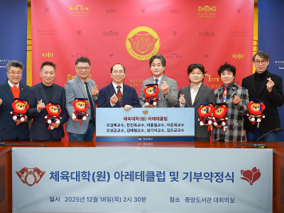 교류/실천경희 품에서 받은 행복, 나눔으로 실천해2026.01.07URL체육대학 정정택 동문과 체육대학(원) 교원 8명이 나눔을 실천했다. 감사를 전하기 위한 행사가 12월 18일(목) 국제캠퍼스 대회의실에서 개최됐다.체육대학(원) 동문, 교원 발전기금 전달식 개최“인생의 버팀목 되어준 경희에 감사”연말 체육대학(원)에 따듯한 애정의 손길이 이어지고 있다. 교원과 동문이 기부를 매개로 선과 나눔을 실천했다. 실천의 주인공은 체육학과 84학번 정정택 동문과 체육대학(원) 교원 8명(김도균·오경록·한진욱·여홍철·이준희·조성균·김태형·성기석)이다. 이들은 인생에 버팀목이 되어준 경희에 감사를 전하며 후배에게 조금이나마 도움 되길 바란다는 뜻을 전했다.“후배에게 조금이나마 도움되길”12월 18일(목) 국제캠퍼스 중앙도서관 대회의실에서는 고귀한 실천에 감사를 전하는 기부금 약정식이 진행됐다. 행사에는 김진상 총장과 김도균 대외협력처장, 오경록 체육대학 학장 한진욱·이준희·조성균·김태형 교수, 성기석 체육대학원 겸임교수 및 동문회장, 정정택 동문 등이 참석했다.체육대학에 퍼지고 있는 나눔의 물결에 감사를 표한 김진상 총장은 “시대적 주요 변곡점에 다다른 만큼 체육인에 대한 역량 재정의가 필요한 시기다. 미래를 위한 여정에 동참해 주셔서 감사하다. 체육대학 발전을 위해 숙의하며 경희 체대가 한국을 넘어, 세계 최고의 체육대학이 될 수 있도록 노력하겠다”고 전했다.정정택 동문은 체육학과를 졸업한 이후 평창군체육회 회장, 대한레슬링협회 부회장 등을 역임했다. 그는 “체육대학을 졸업한 덕분에 체육 행정의 길을 걸을 수 있었다. 그동안 고마움을 표할 방법이 없었는데 이번 기회를 통해 실천하게 됐다. 후배들에게 조금이나마 도움되길 바란다”며 모교에 대한 진심 어린 애정을 밝혔다.행복이 기부의 원천체육대학 교원 8명은 나눔을 통해 행복을 실천하는 교원 모임인 아레테클럽에 가입했다. 고대 그리스 철학자 소크라테스는 선을 추구하는 좋은 삶을 ‘아레테’라고 봤다. 이 말과 같이 체육대학 교원이 한마음으로 기부하게 된 원천도 ‘행복’이었다. 오경록 학장은 “경희대와의 인연으로 행복하게 교직 생활을 이어왔다. 이 행복이 자연스레 기부로 이어졌다. 교육 환경 개선에 도움되길 바란다”고 말했다. 한진욱 교수는 “체육대학에 입학해 존경하는 스승과 평생의 반려를 만나 행복할 수 있었다. 이번 실천으로 학교에 행복을 되돌려 줄 수 있어 기쁘다”고 말했다.이준희 교수는 “혼자가 아니라 함께 지내온 교수들이 같은 마음으로 참여했다는 점에서 귀하고 행복한 순간”이라는 소감을 전했다. 조성균 교수에게 경희대는 자랑이었다. 그는 “태권도 전공자에게 경희는 일생 동안 등에 새겨진 영광”이라고 밝혔다. 김태형 교수는 “직장 생활을 마무리하고, 교수로 활동할 기회를 준 경희에 감사한 마음”이라고 말했다.성기석 교수는 “기부는 관심과 사랑에서 나온다. 대학 발전을 위한 동문의 참여가 많아지길 바란다”고 기원했다. 김도균 처장은 “대학에 대한 사랑이 더욱 깊어지는 시기다. 뜻깊은 실천에 함께해준 동료 교수님께 감사를 전한다”고 말했다.대외협력처는 대학 구성원의 기부 문화 확산을 위해 2021년 아레테클럽을 발족했다. 아레테클럽은 총 3천만 원 이상 기부하거나 약정한 경희대 소속 교원을 가입 대상으로 한다. 가입 교원에게는 연구실 명패와 무료 주차권, 무료 건강검진권 등의 예우 프로그램이 제공된다.