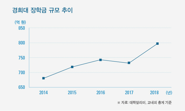 경희는 최근 10년간 등록금을 동결하고, 장학금을 점차 확대했다. 장학금 규모는 2014년 681억여 원, 2015년 719억여 원, 2016년 742억여 원, 2017년 732억여 원, 2018년 798억여 원으로 늘었다(교내외 총계 기준). 수입 다변화와 국가장학금 수주 확대 등을 통해 장학 예산을 늘려왔기에 가능했다.