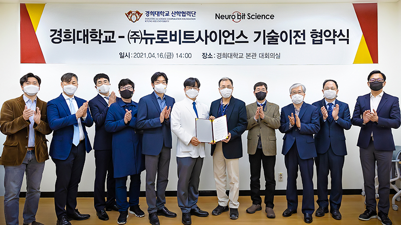 경희대학교 산학협력단과 뉴로비트사이언스(이하 뉴로비트)가 신약 개발 후보물질 ‘NBS501’에 대한 기술이전 협약을 체결했다. 이번 협약을 통해 경희대는 척추관 협착증 통증 치료약의 후보물질을 제공하고, 뉴로비트는 이를 기반으로 척추 손상 환자에게 사용할 수 있는 신약을 개발한다. 후보물질은 화학과 이재열 교수와 나노의약생명과학과 이경태 교수, 의예과 윤태영 교수 연구팀의 공동연구로 개발했다. 협약식에는 산학협력단 김우식 단장과 이경태 교수, 이재열 교수, 윤태영 교수, 뉴로비트 김수곤 대표와 박영광 공동대표, 김용석 자문위원단 단장 등이 참석했다.