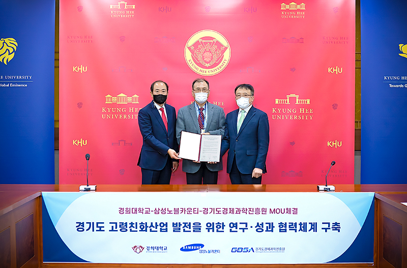 경희대학교와 경기도경제과학진흥원, 삼성노블카운티가 지난 12월 6일(월) 국제캠퍼스 중앙도서관 대회의실에서 ‘경기도 고령친화산업 발전을 위한 연구·성과 협력체계 구축 협약’을 체결했다.