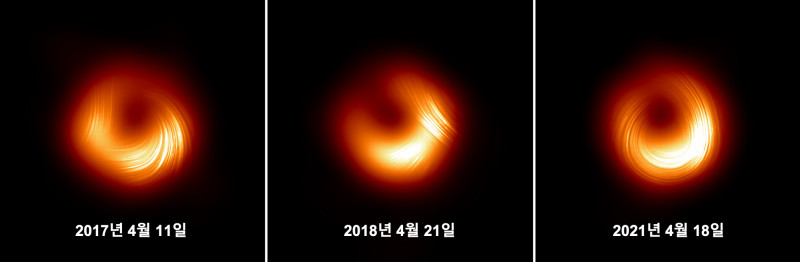 연구단은 그간의 관측 영상을 상호 비교해 M87 블랙홀의 시간 변화를 집중적으로 탐구했다. 그 결과 블랙홀 그림자로 불리는 중심부의 검은 부분과 블랙홀의 막대한 중력에 의해 휘어진 빛이 만들어내는 고리 모양은 크기가 일정하지만, 블랙홀 주변 편광의 패턴이 시간에 따라 역동적으로 변화함을 확인했다.