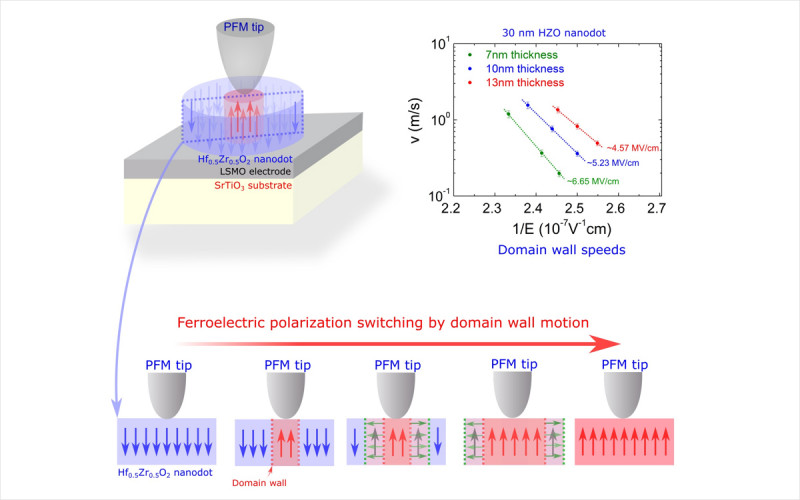 응용물리학과 손종역 교수 연구팀은 에피택셜 구조의 하프늄-지르코늄 산화물(Hf₀.₅Zr₀.₅O₂, HZO) 나노점(nanodot)을 활용해 강유전체의 분극 스위칭을 정밀 분석하고, 크기와 두께에 따른 전기적 한계를 규명했다. 연구팀은 지름 30~50나노미터 크기의 나노점에서 도메인 벽(domain wall)의 이동 속도와 활성화 전계(activation electric field)를 체계적으로 측정했다.