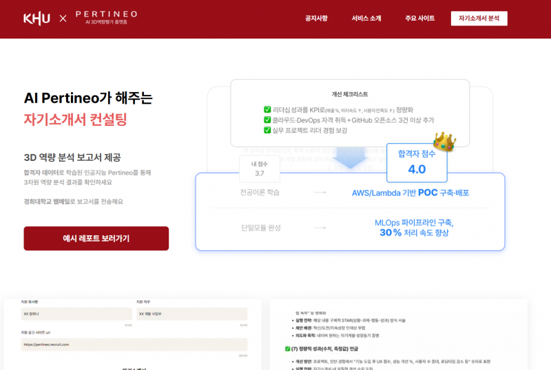 이들이 개발한 플랫폼의 이름은 라틴어로 ‘의미를 갖다’라는 뜻을 가진 ‘Pertineo(이하 페르티네오)’다. 플랫폼에 지원자 정보를 입력하면 합격 데이터, 실시간 웹 서치 정보를 바탕으로 직무적합성과 가능성을 평가한다.