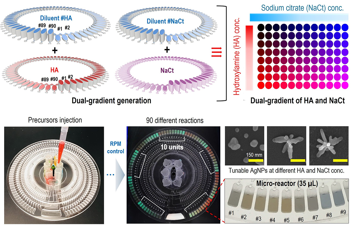 소형 원심 미세유체 칩은 이온을 금속 은으로 환원시키는 하이드록실아민(HA)과 입자 표면을 안정화하고 성장 방향을 조절하는 시트르산나트륨(NaCt)의 농도를 자동으로 조합해 총 90개의 반응 조건을 생성한다. 이 과정에서 두 물질의 상대적 비율에 따라 은 나노입자의 성장 거동이 달라지고, 그 결과 구형의 나노입자 또는 별 모양의 나노스타 구조가 선택적으로 형성된다. 이를 통해 연구팀은 반응 조건과 나노입자 형태 사이의 상관관계를 고처리량으로 효율적으로 분석할 수 있었다.