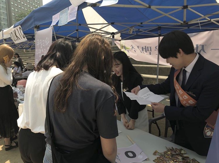 재학생들이 쿠밀리 부스에서 ox퀴즈를 진행하고 있다.