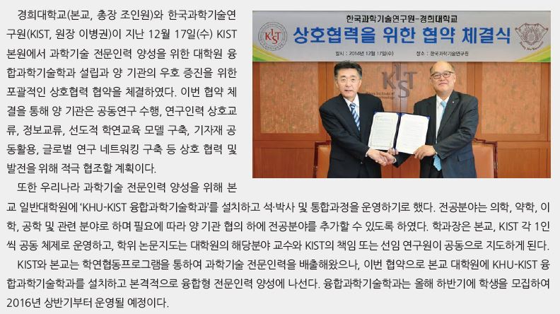 KIST 학연협력 등록일 15-02-13 00:00 조회수 638 한국과학기술연구원 (KIST) 와 과학기술 전문인력 양성을 산호협력 협약 체결 2014. 12. 17 (수) 이전글회기시장 살리는 '한 지붕 네 청년' 다음글 삼성전자 산학협력 목록
