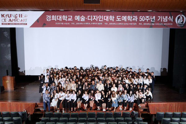 지난 9월 15일(토)에 경희대학교 예술디자인대학관 A&D홀에서 도예학과 50주년 행사가 개최 되었다. 행사는 본식 행사에 앞서 동문 회장 및 원로 동문들의 기념식수를 시작으로 진행되었으며, A&D 갤러리에서 도자기 전시회를 보며 즐기는 다과회와 도예학과 50주년을 설명하는 오프닝 및 연혁소개 동영상 시청 등 많은 볼거리를 통해 행사는 더욱 열기를 올렸다.