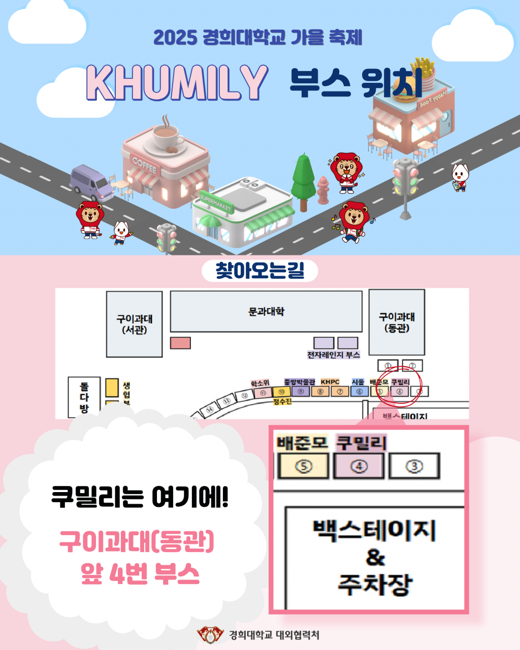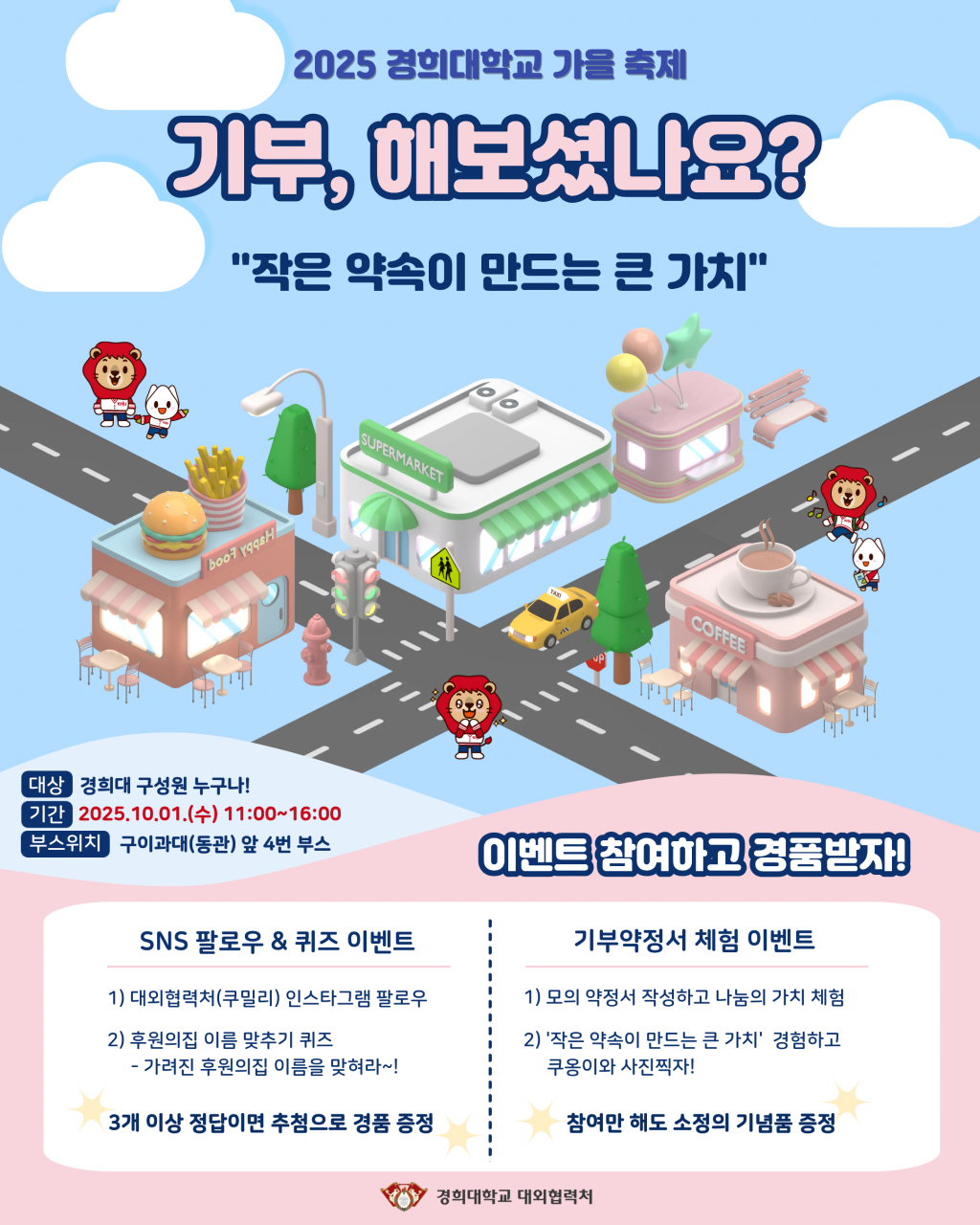 [행사] [서울] ★2025 가을 축제 기념 '작은 약속이 만드는 큰 가치' 쿠밀리 부스 운영★ 등록일 25-09-29 10:24 작성자 give01 조회수 37 다음글 [국제] 2024년도 후기 학위수여식 후배사랑 기부이벤트 : 졸업키트 혹은 이름표 단 쿠옹이 인형증정 목록