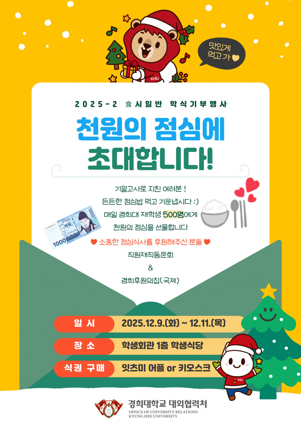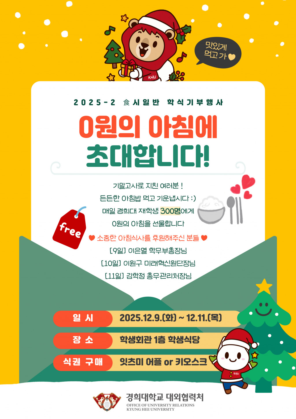 [행사] [국제] 2025-2 학식기부행사 '食시일반' 0원의 아침 & 천원의 점심♥ (12/9~12/11) 등록일 25-12-12 09:19 작성자 give01 조회수 110 이전글[서울] 2025-1 학식기부행사 '食시일반' 0원의 아침 & 천원의 점심♥ (12/9~12/11) 다음글 [국제:교류협력] 삼성노블카운티 'Fall in Love Market' 자선 바자회 개최 (10/24) 목록