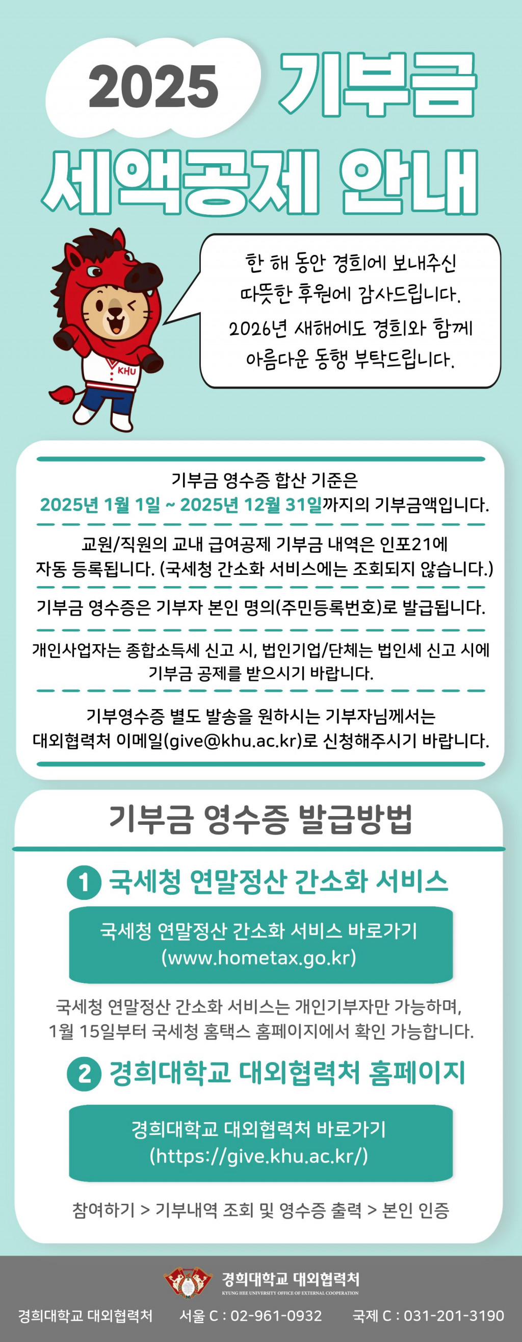 [기부,일반] [연말정산] 2025 기부금 세액공제 안내 등록일 26-01-14 11:20 작성자 give01 조회수 154 다음글 [서울] 2025-1 학식기부행사 '食시일반' 0원의 아침 & 천원의 점심♥ (12/9~12/11) 목록
