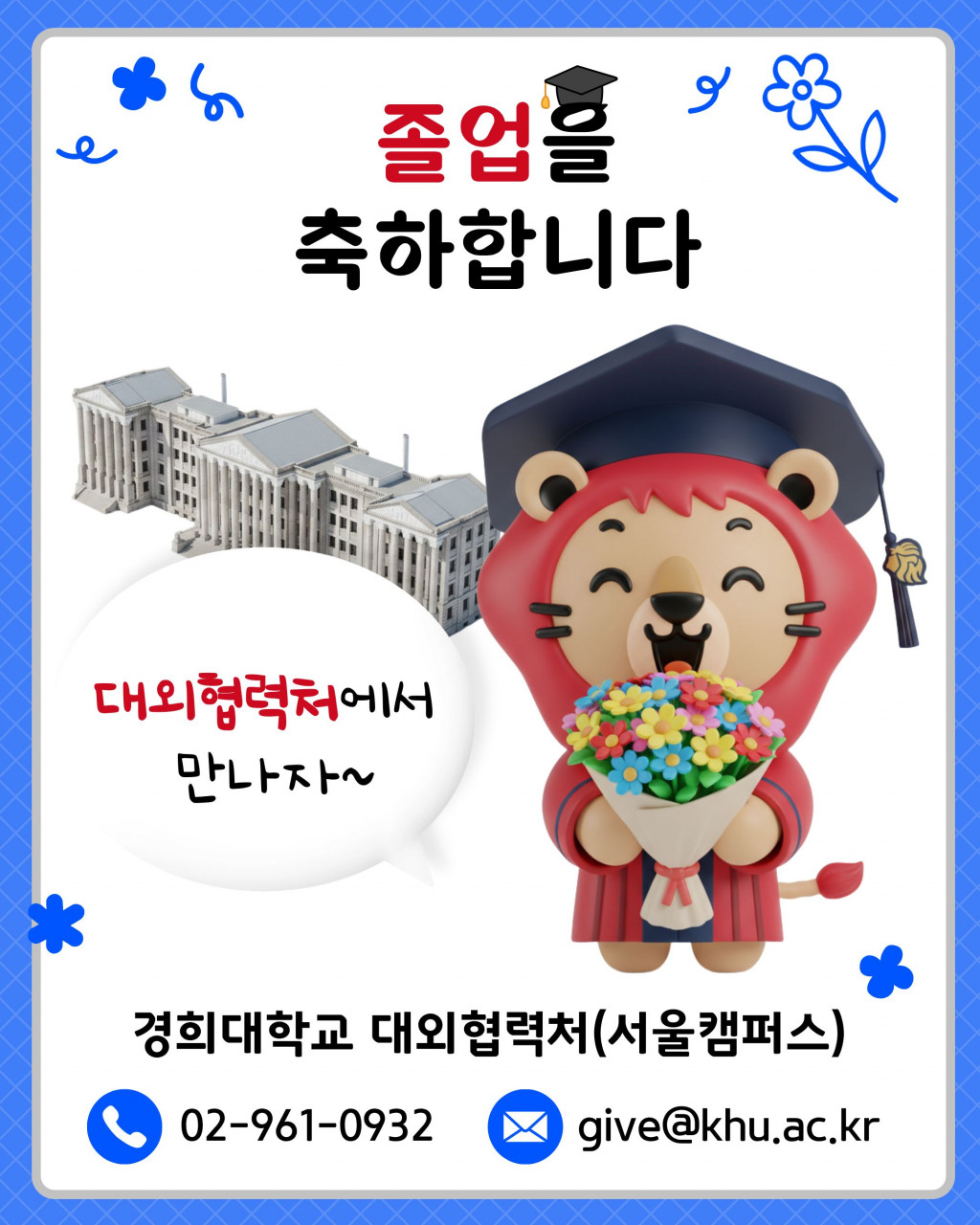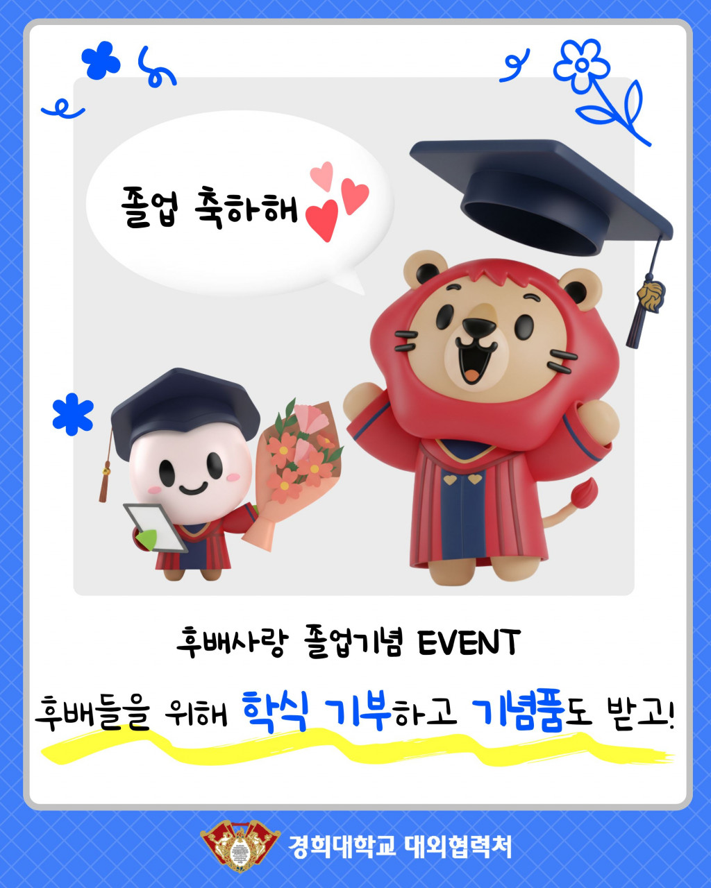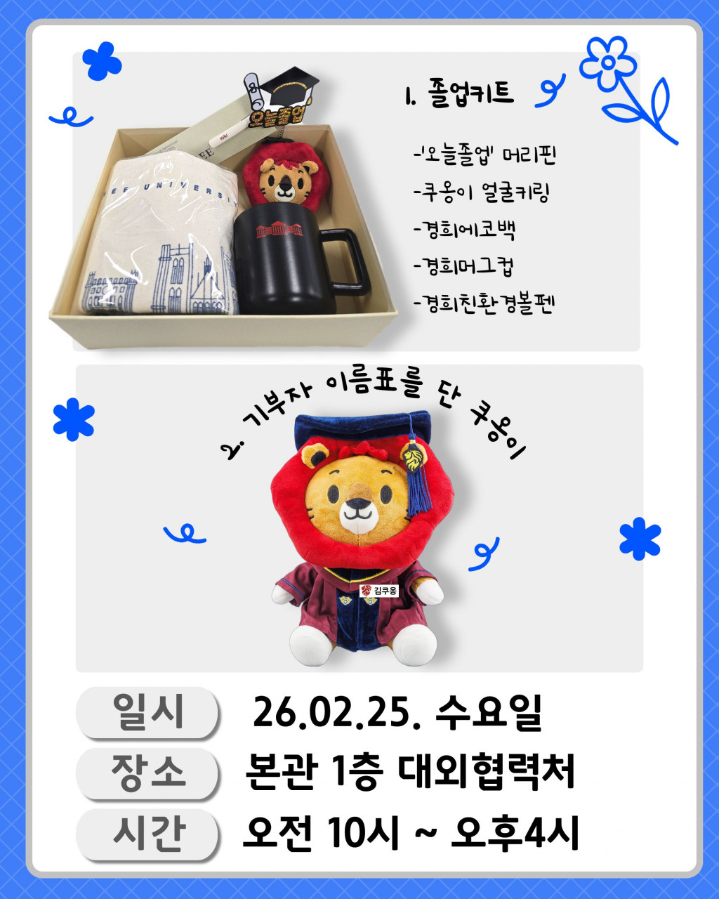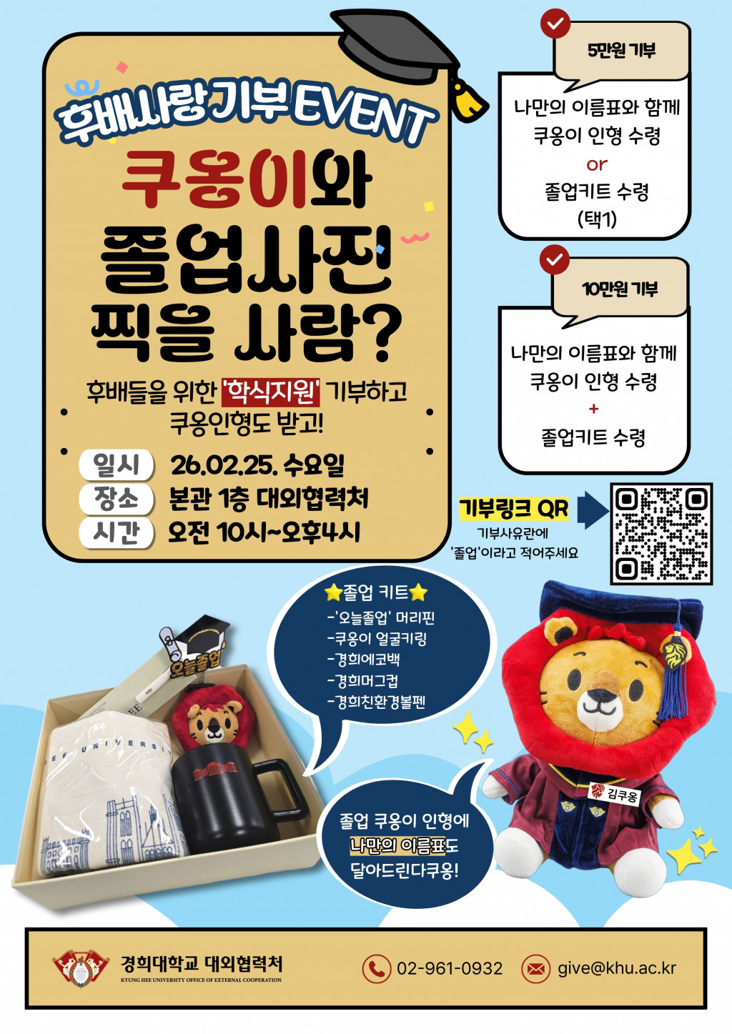 [기부] [서울]2025 전기학위수여식 후배사랑 기부 이벤트 : 졸업키트 혹은 이름표를 단 쿠옹이 인형 증정 등록일 26-03-03 15:19 작성자 give01 조회수 132 이전글[국제]2025학년도 전기학위수여식 후배사랑 기부 이벤트 : 졸업키트 혹은 이름표를 단 쿠옹이 인형 증정 다음글 [연말정산] 2025 기부금 세액공제 안내 목록