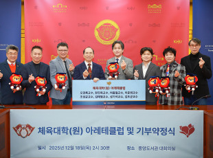 체육대학 정정택 동문과 체육대학(원) 교원 8명이 나눔을 실천했다. 감사를 전하기 위한 행사가 12월 18일(목) 국제캠퍼스 대회의실에서 개최됐…