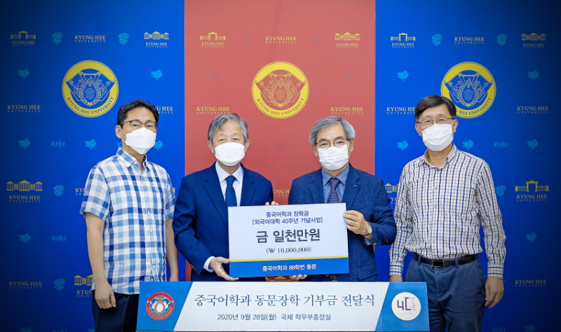 1980년 개교한 외국어대학이 올해 40주년을 맞이했다. 이를 기념해 후배 사랑을 실천하는 외국어대학 동문 기부가 이어지고 있다. 지난 9월 28일(월) 국제캠퍼스 대회의실에서 외국어대학 40주년 기념사업 기부금 전달식이 개최됐다. 익명의 중국어학과 동문이 외국어대학 학생들을 위해 장학금 1,000만원을 전달했다.