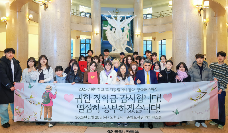 단출한 옷차림의 한 90대 할머니가 짐이 한가득 담긴 배낭을 메고 지난 5월 본관 건물로 들어섰다. 지팡이를 대신해 우산을 땅에 짚던 할머니는 복도에 나온 대외협력처 직원에게 “기부하러 왔다, 총장님을 만나러 왔다”고 말했다. 곧이어 배낭에서 꺼낸 신문지 더미 속에는 천만 원씩 세 묶음, 100만 원 스무 묶음, 총 5천만 원의 현금이 들어있었다. '회기동 할머니 장학금'은 이렇게 마련됐다. 당시에도 “동대문구 회기동에 산다”는 말만 남기고 떠난 할머니는 20일 중앙도서관 1층 컨퍼런스룸에서 열린 장학금 수여식에도 모습을 드러내지 않았다. 기부자는 평생 파마 한 번 해본 적 없을 정도로 절약 정신이 몸에 밴 삶을 살아왔던 것으로 알려졌다.